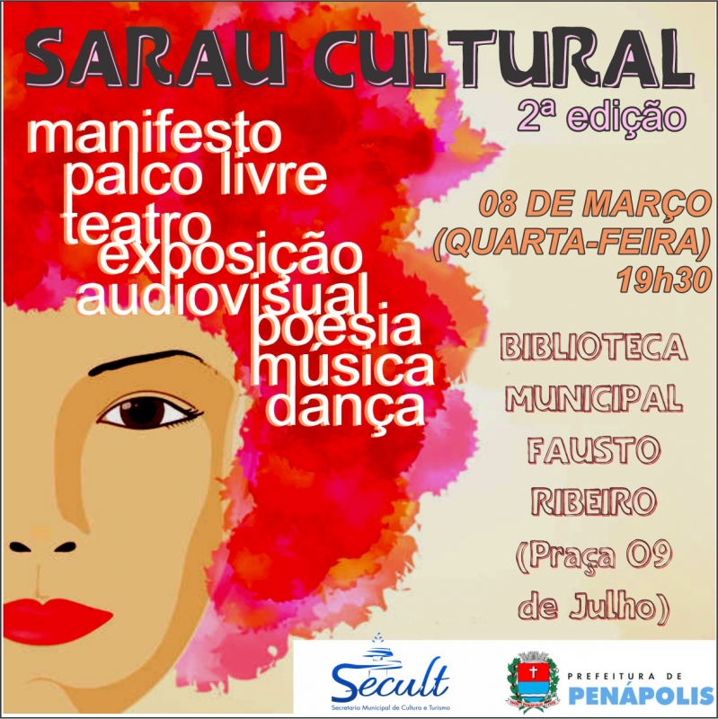 A Secult – Secretaria Municipal de Cultura e Turismo da Prefeitura de Penápolis realizará na próxima quarta-feira, dia 08 de março, a 2ª edição do Sarau Cultural em celebração ao Dia Internacional das Mulheres. O evento acontece a partir das 19h30, na Biblioteca Municipal “Prof. Fausto Ribeiro de Barros”, com entrada franca para toda comunidade.